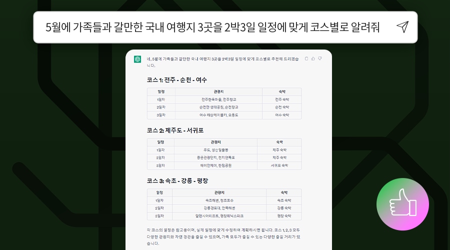 이제 AI서비스 활용 능력이 중요해진 시대예요. 챗GPT에게 똑똑하게 질문하기 위해서는 어떻게 해야 할까요? 만약 여행지를 추천받고 싶다면 "국내 여행지 추천해줘"라는 단순한 질문보다 "5월에 가족들과 갈만한 국내 여행지 3곳을 2박 3일 일정에 맞게 코스별로 알려줘"라는 구체적인 질문이 좋아요.
