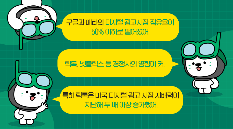 두 기업 모두 광고 관련 매출은 여전히 성장하고 있지만 틱톡, 넷플릭스 등 경쟁사에 비해 성장 속도가 느려 점유율이 하락 중이에요. 이로 인해 디지털 광고 분야에서 매출은 지속적으로 높아지더라도 앞으로 과거 수준의 영향력을 확보하기 어려울 것으로 전망돼요.