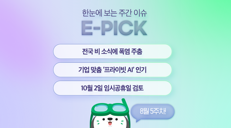 이루다마케팅의 Pick을 받은 한 주간의 이슈를 알아보는 시간! 오늘은 전국 비 소식에 폭염특보 해제 / 프라이빗 AI 인기 / 10월 2일 임시공휴일 검토 소식을 준비했어요. 어떤 내용인지 함께 살펴볼까요?👀