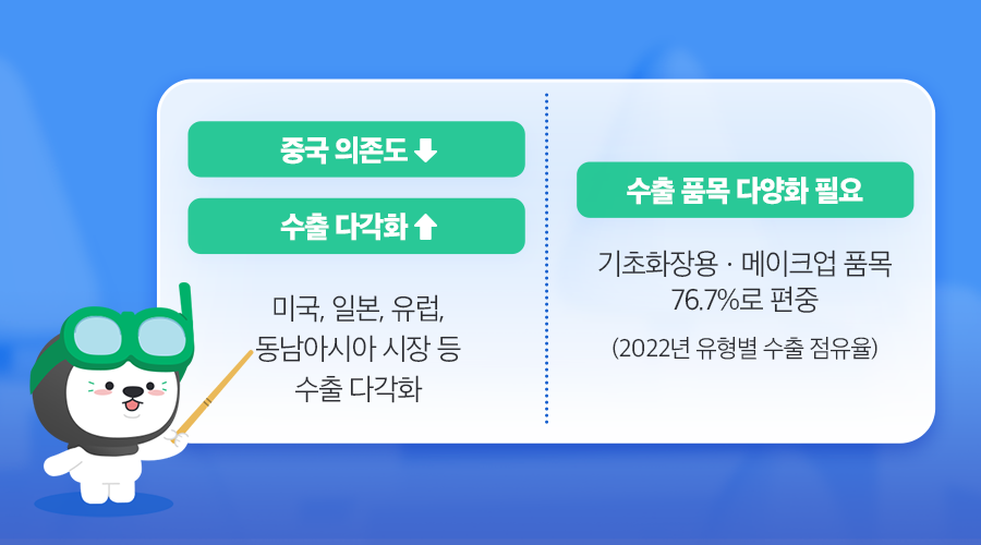 현재 우리나라 화장품 수출 점유율을 보면 기초화장용 · 메이크업 품목이 76.7%(2022년 기준)로 과도하게 큰 비중을 차지하고 있는데 이러한 편중 현상에서 벗어나 수출 품목을 다양화해야 할 필요성이 제기되고 있어요.