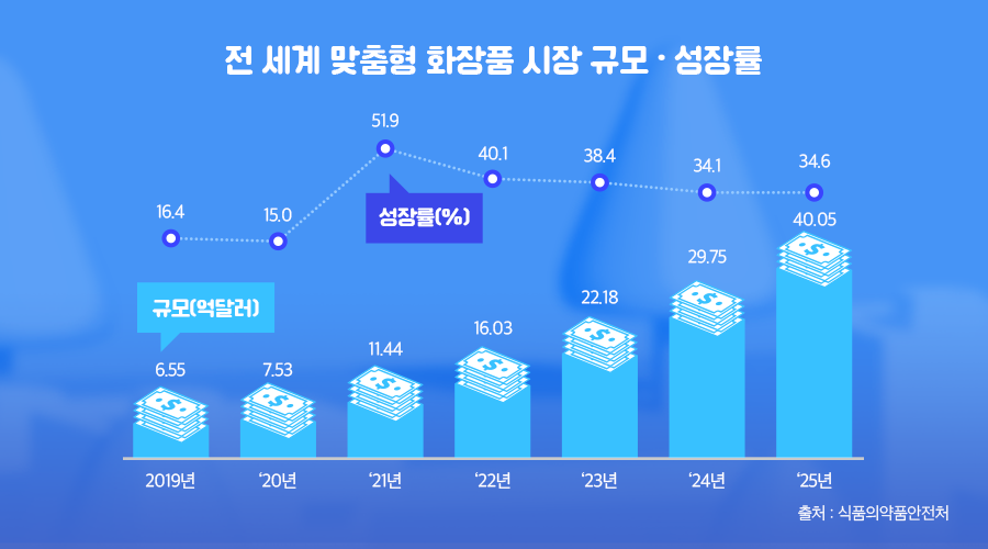 개인의 피부 특성과 취향에 맞는 제품에 대한 소비자들의 수요가 늘면서 뷰티업계는 맞춤형 기술을 상품과 서비스에 적용하고 있어요💄 전 세계 맞춤형 뷰티 시장이 연간 35% 성장하고 있는 만큼 정부도 '맞춤형 화장품'을 K뷰티의 신성장동력으로 주목했는데요! 여기서 잠깐✋🏻 맞춤형 화장품이란? AI(인공지능) 또는 빅데이터 등을 활용해 개인의 피부 상태나 취향을 반영해 만드는 제품을 말해요.