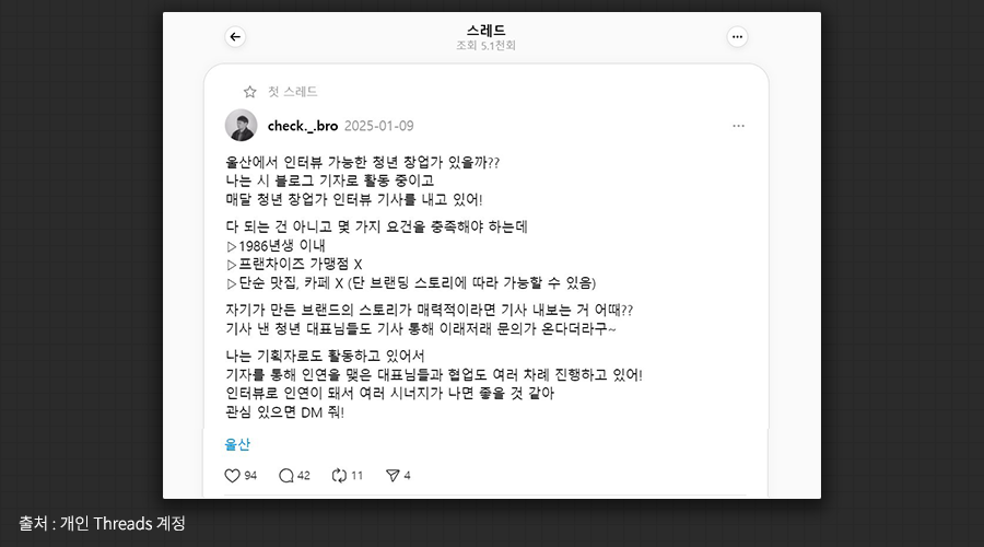 - 실제로 스레드를 통해 오프라인 인터뷰가 세 건 성사됐고, 온라인에서의 소통이 마치 친구와 대화하는 것처럼 느껴졌다는 후일담이 있습니다.