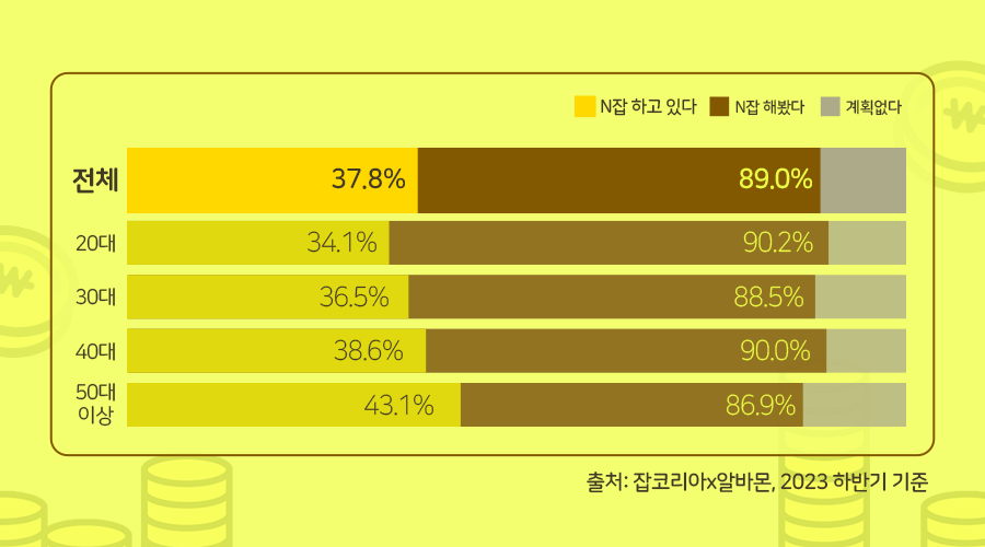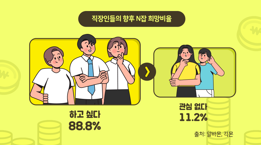 일부지만 기업의 강한 반대 입장 표명에도 불구하고 20대~50대 이상의 직장인들은 평균 88.8%가 N잡을 하고 싶다고 답했어요🙆♂️