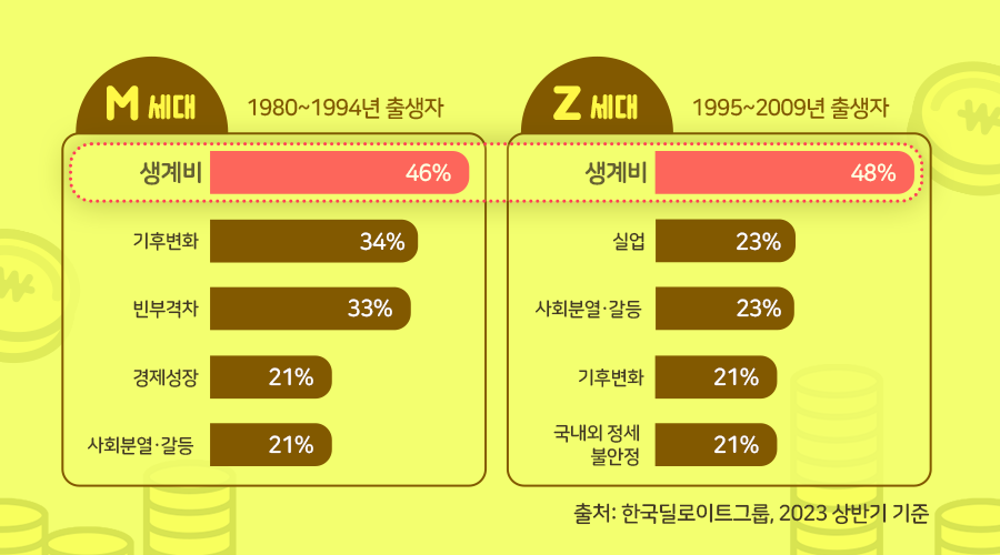 👉M세대는 2위 기후변화, 3위 빈부격차를 비슷하게 꼽았는데요. 기후변화는 환경에 대한 불안을 느낀 빈도가 높아 선정된 이유고, 빈부격차는 말 그대로 경제적인 차이를 의미해요. 그렇다면 👉Z세대의 경우는 어떨까요? 이들은 2위부터 5위까지의 이유가 거의 비슷한 숫자로 집계됐고 특히 실업과 사회분열·갈등이 공동 2위로 자리했어요.