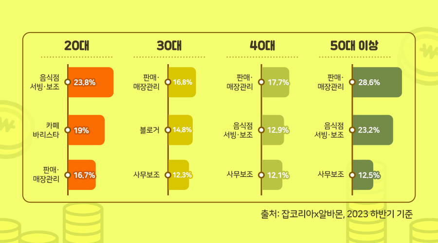 📎20대는 각종 오프라인 아르바이트가 1위/2위로 높게 랭크되어 있었고 📎30대부터 50대 이상까지는 판매·매장관리가 1위로 조사되었는데요. 세대별로 업무가 모두 비슷하게 중복되지만 30대는 블로거 활동이 2위를 차지해 눈에 띄는 결과를 보여주었습니다🙋♂️
