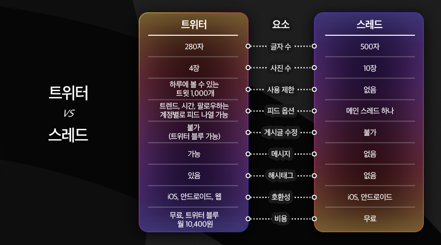 트위터와 스레드는 호환성에도 차이가 있는데요. 트위터는 iOS, 안드로이드, 웹에서 사용 가능하지만 스레드는 아직 웹에서는 호환되지 않아요. 마지막으로 트위터는 유료 구독 서비스인 트위터 블루 서비스(게시물 수정, 글자 수, 게시물 노출 등에서 특혜 제공)를 월 10,400원에 제공하고 있지만 스레드는 현재 별다른 구독서비스를 내놓진 않고 있어요.