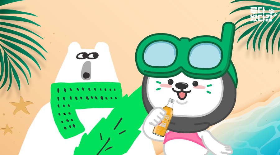 아임얼라이브 팝업스토어 포토존에서 가장 눈에 띄었던 건 역시 대표 캐릭터인 얼라이브베어였습니다. 얼라이브베어는 콜라가 싫어 무리를 탈출해, 건강 탄산을 찾아 나서는 북극곰이에요. 그 외에도 콤지, 콤부판다, 요가몽키까지 다양한 친구들과 함께 사진을 찍을 수 있었습니다. 야자수와 서핑보드 등 서피비치에 잘 어울리는 컨셉이었던 거 같아요.