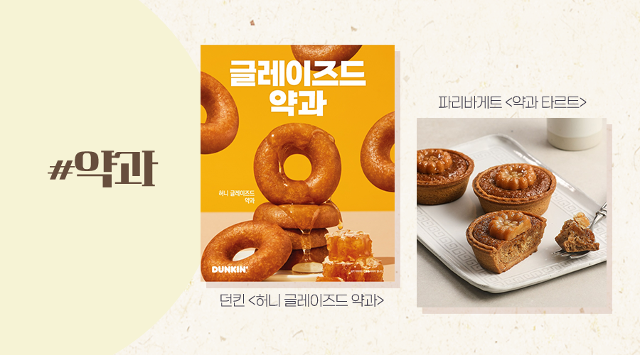 이 같은 약과의 높은 인기에 식품업계는 줄줄이 약과를 활용한 할매니얼 디저트 신메뉴를 출시하고 있는데요. 던킨은 글레이즈드 도넛 모양의 약과에 달콤한 허니 글레이징을 입혀 약과 특유의 달달하면서 꾸덕한 맛과 식감을 살린 '허니 글레이즈드 약과'를 출시했고, 파리바게트는 타르트 속에 조청으로 만든 시나몬 카라멜 필링을 담고, 위에는 미니 약과를 올린 '약과 타르트' 제품을 선보였어요.