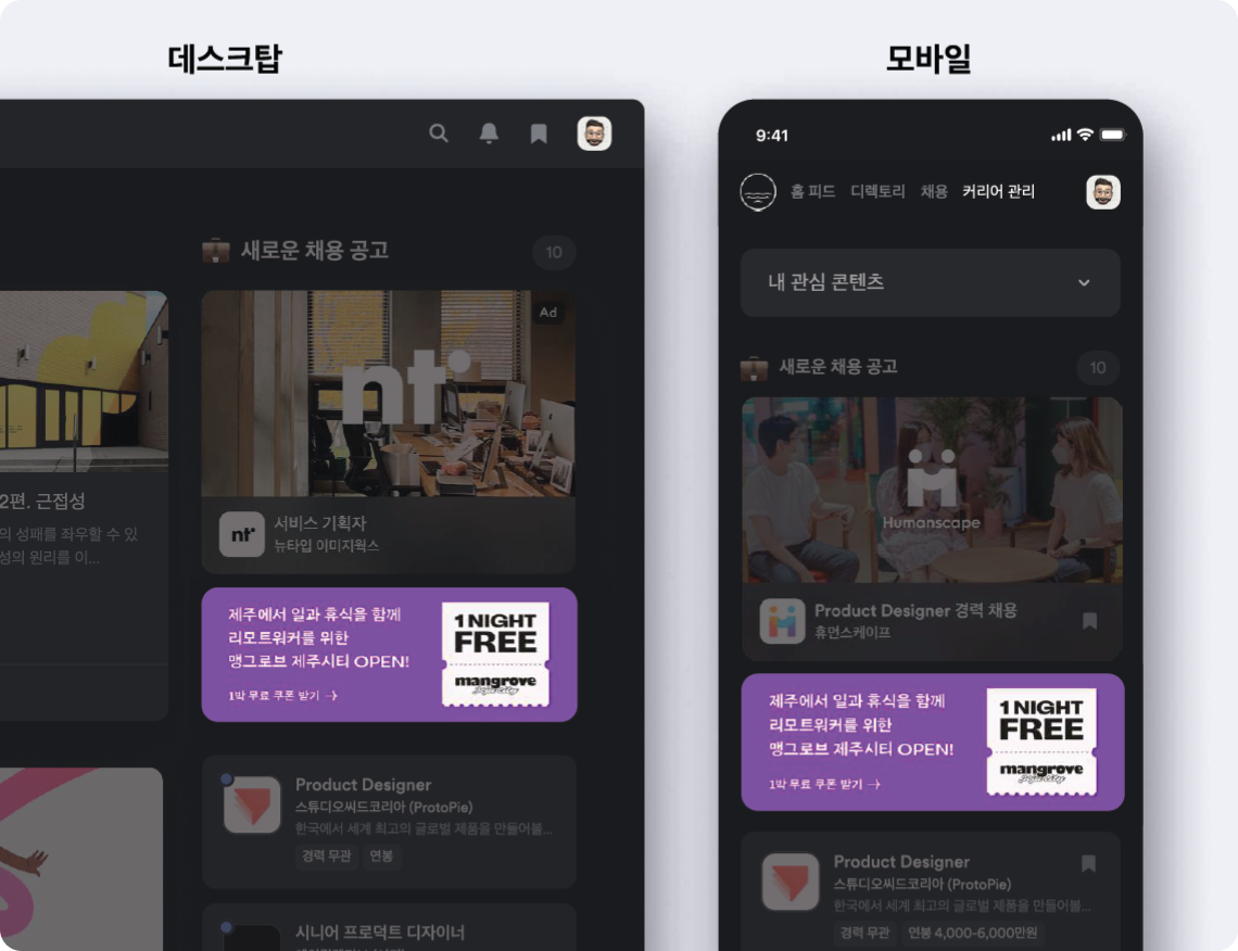 영향력 및 구매력이 높은 경력직 디자인 · 개발 · 기획 · 마케팅 직군의 사용자로 구성되어 있습니다.