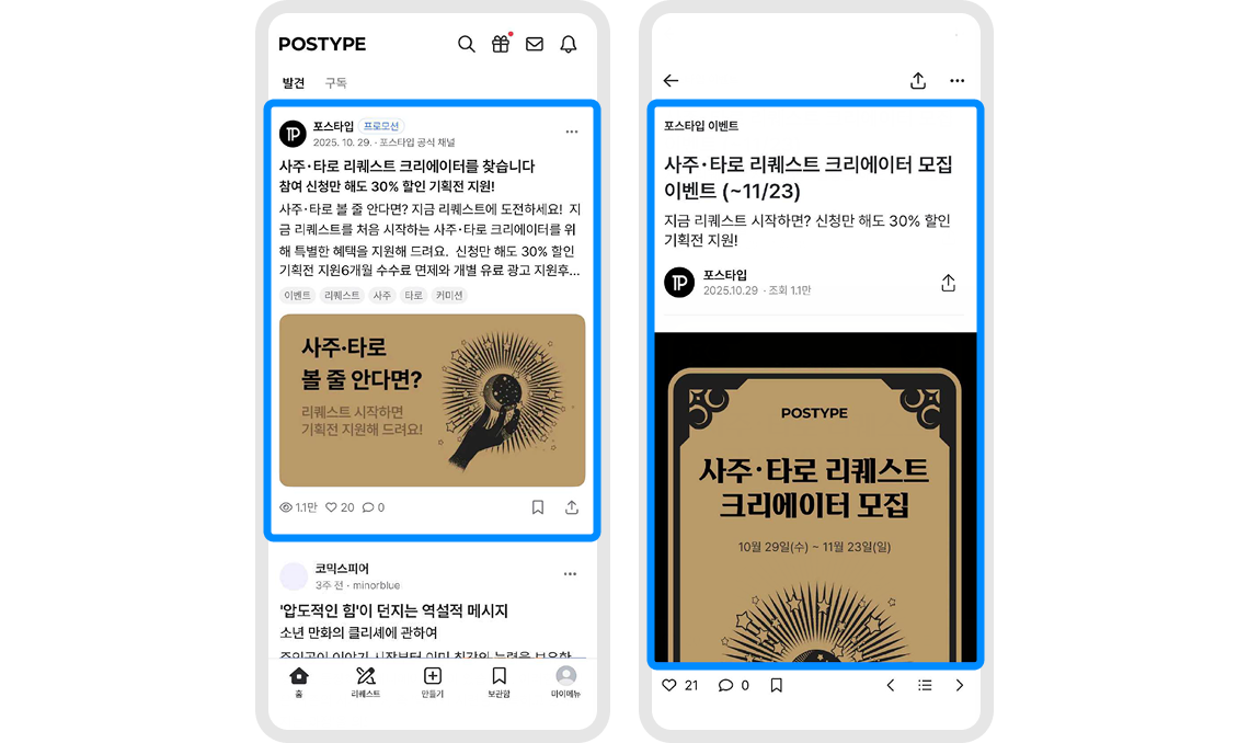 매월 12만개의 신규 포스트가 생성되는 지면에 자연스럽게 노출돼요