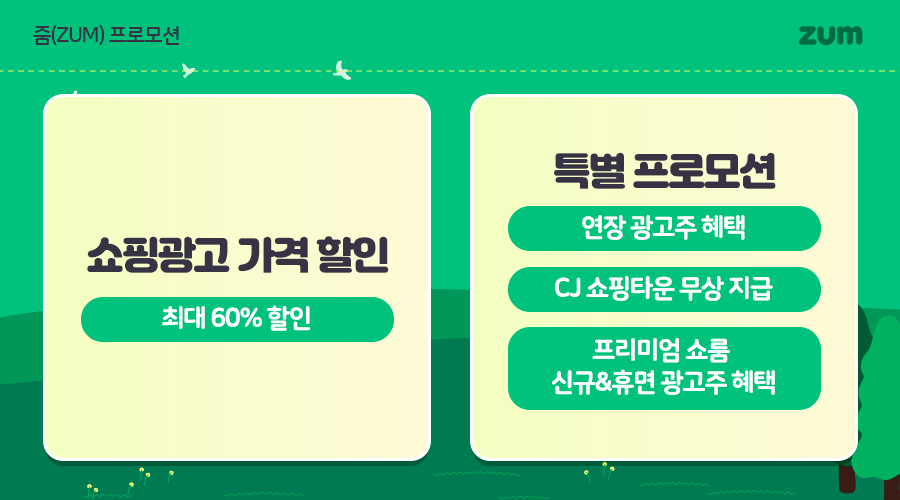 - 내용 : 프리미엄 쇼룸(기본, 패키지, 플러스), 쇼핑박스, 하단배너, ZUMxCJ 쇼핑타운 상품 최대 60% 할인