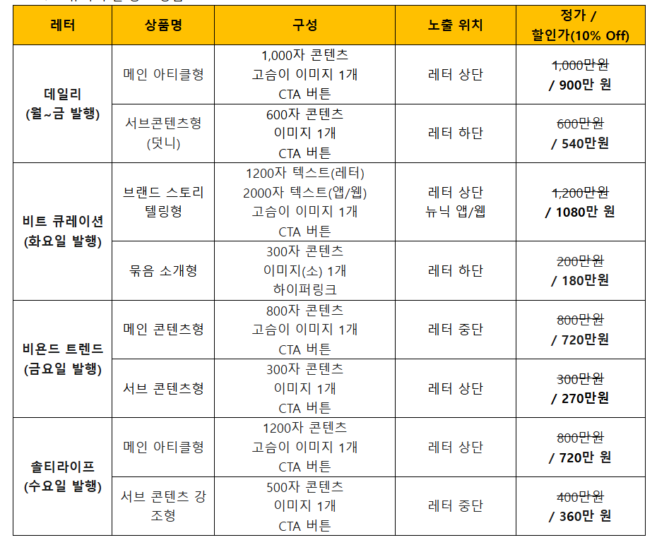 1. 뉴스레터 광고 : 3가지 라인의 뉴스레터 구성되어 있으며 다양한 상품으로 발송 가능