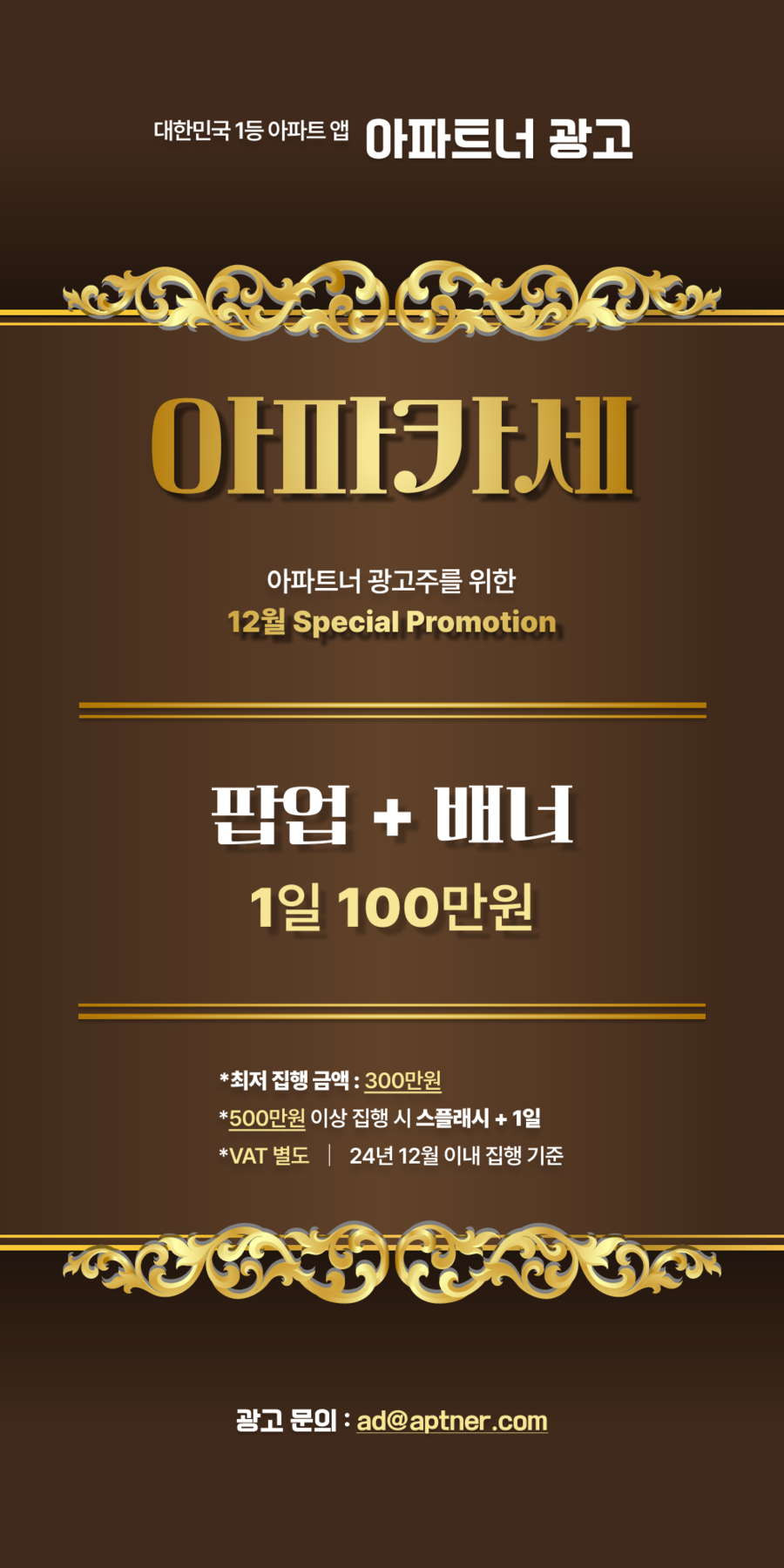 아파트너 광고 상품의 경우, 스플래시 / 팝업 / 배너 / 라운지 / 댓글 이벤트 5종으로 구성되어 있고 과금 방식은 모두 CPP이며, 현재 광고 패키지 할인 프로모션 진행 중입니다.