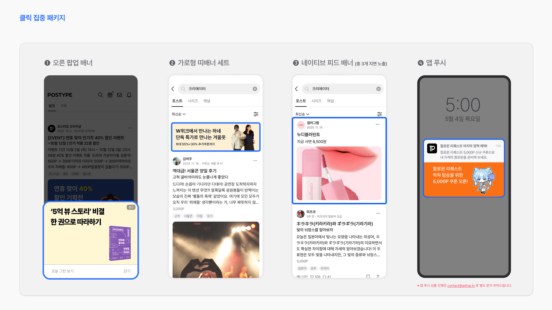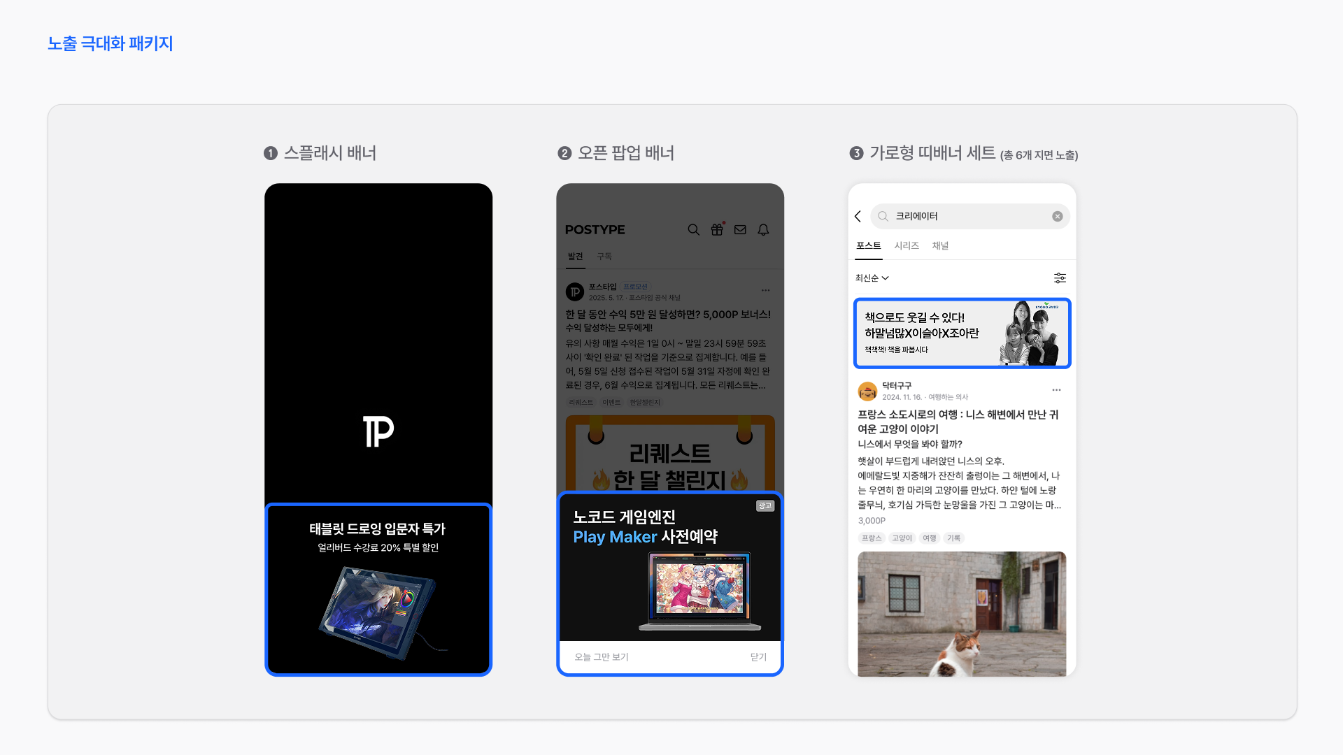 구성: 오픈 팝업 배너 + 가로형 띠 배너 + 네이티브 피드 배너