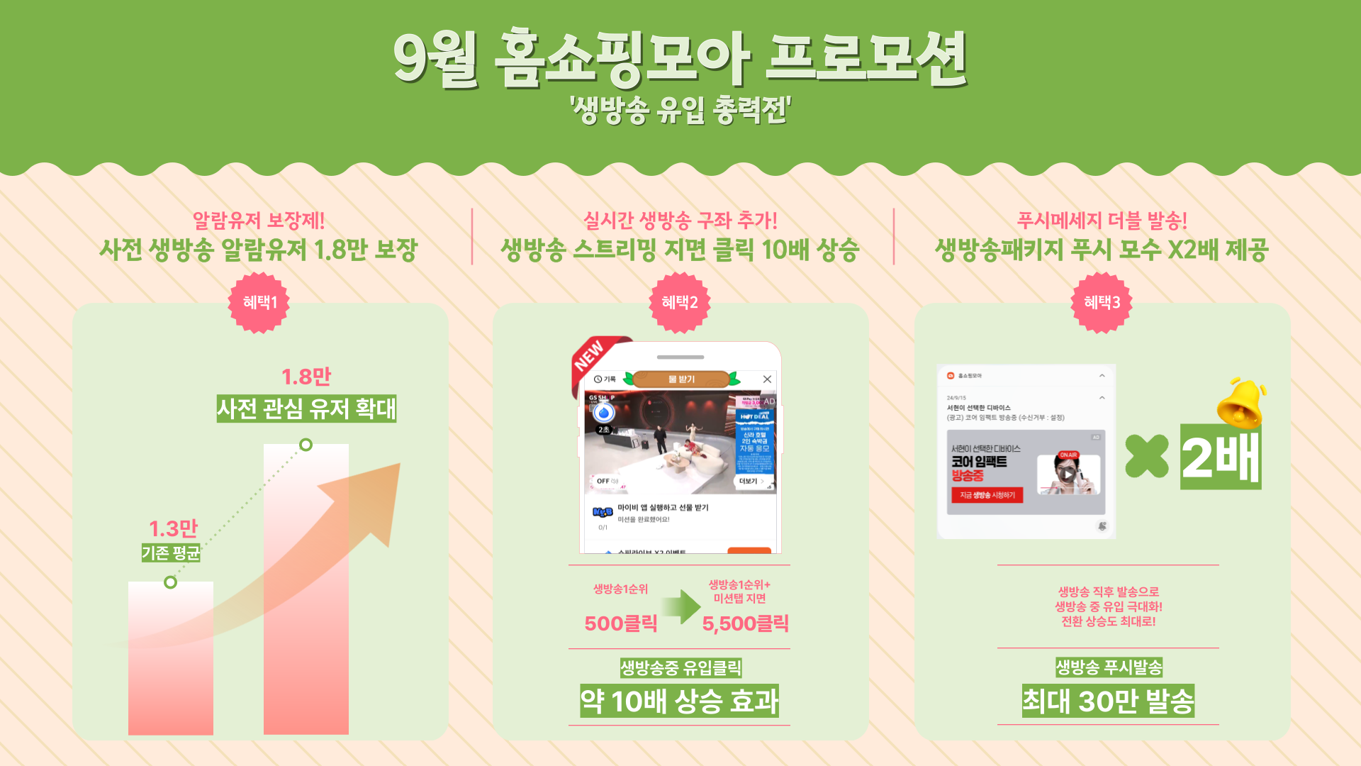 1. 생방송패키지 : 방송 전 고객들의 알람 설정을 유도하여 생방송 유입 극대화
