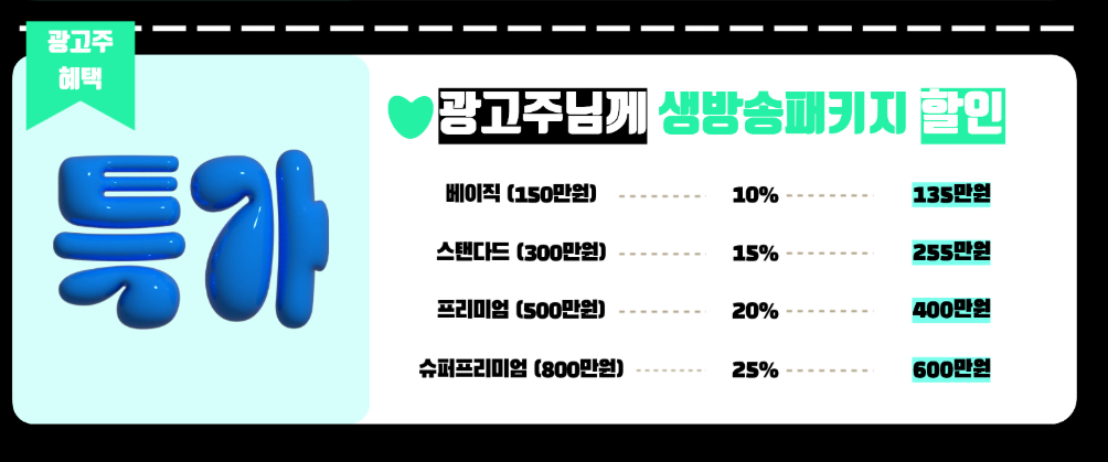 - 기간 내 집행 완료된 [생방송 패키지] 캠페인 기준, 단가 할인 적용(아래 이미지 참고)
