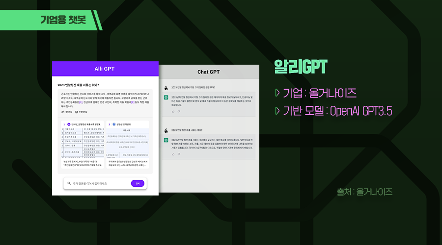 직장인들 주목❗ 기존과는 조금 다른 챗봇이 등장했어요. 알리GPT는 질문에 대해 웹사이트 속 답변만 알려주는 게 아닌 우리 회사 맞춤형 정보를 알려줘요. 어떻게 그게 가능하냐고요? 산업군별로 특화된 용어, 약어, 지식을 사전에 학습하고 해당 기업의 문서, 매뉴얼 등을 업로드 한 후 챗봇을 이용하면 기업 문서와 외부 검색을 모두 활용한 답변을 보여줘요. 답변의 출처가 된 문서까지 알려주니 더욱 신뢰가 가죠.