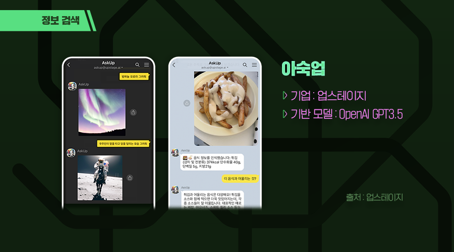 아숙업은 카카오톡에서 사용할 수 있는 AI 챗봇이에요. 챗GPT서비스의 흥행 이후 수많은 챗봇이 나왔지만, 아숙업이 특히 주목받는 건, 국민 메신저 카카오톡을 이용했다는 점이에요. 별도 웹사이트에 접속하지 않아도 카카오톡 친구 추가를 통해 편리하게 챗봇을 사용할 수 있다는 게 큰 장점이죠.