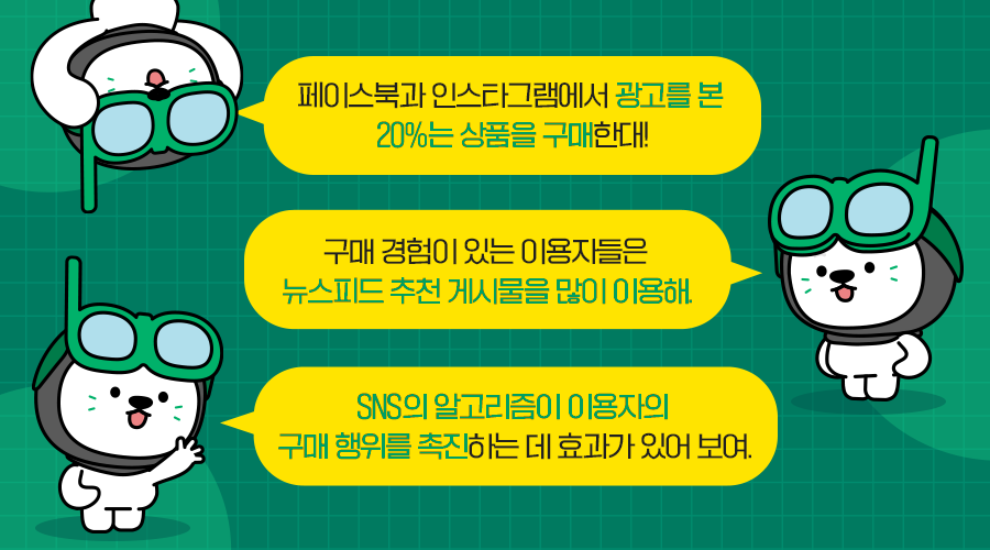 소셜미디어 광고에 대한 구매 경험이 있는 이용자들은 팔로우한 계정에 게시된 글과 자신의 뉴스피드에 추천된 게시물을 가장 많이 이용하는 것으로 파악돼요. 뉴스피드가 추천해 주는 게시물을 많이 이용한다는 점은 SNS 고유의 알고리즘이 이용자의 구매 행위를 촉진하는 데 어느 정도 효과가 있다는 것을 의미한다고 볼 수 있어요.