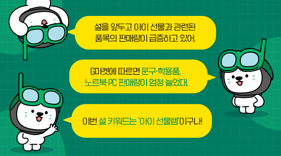 G마켓이 설 프로모션인 '설빅세일'이 시작된 이후(1월 2일~1월 5일) 카테고리 판매량을 지난해 행사 대비 분석한 결과 '문구·학용품'은 104%, '노트북·PC'는 72% 증가했다고 밝혔어요. 또한 '도서·교육'(52%), '장난감·완구'(66%), '자전거·레저'(25%)를 비롯해 영유아를 위한 '출산·육아용품'(23%) 등 일명 '아이 선물템'들이 모두 증가세를 보여요.