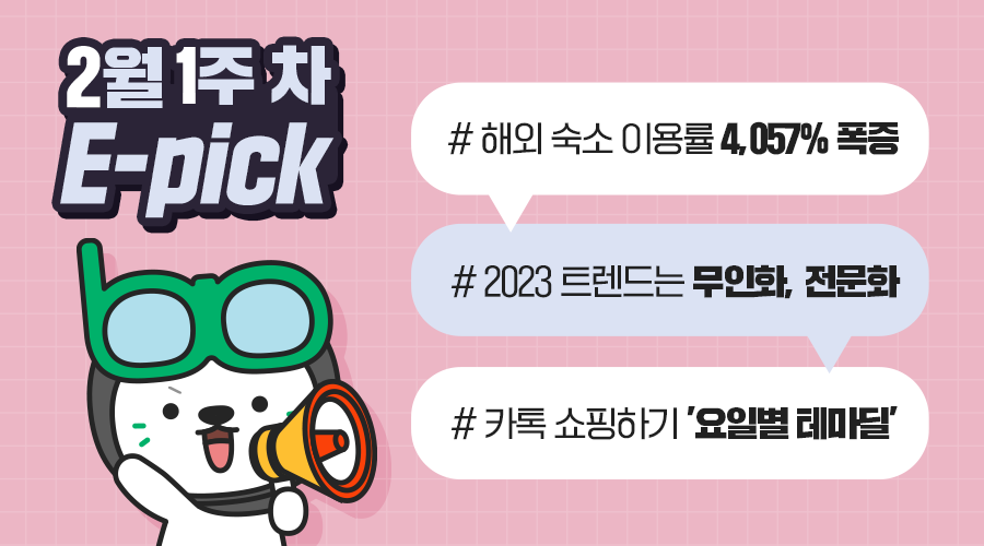 이루다마케팅의 PICK을 받은 한 주간의 이슈를 알아보는 시간! 오늘은 해외 숙소 이용률 4,057% 폭증 / 2023 트렌드는 무인화, 전문화 / 카톡 쇼핑하기 '요일별 테마딜' 소식을 준비했어요. 어떤 내용인지 함께 살펴볼까요?👀