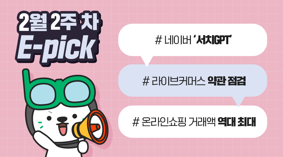 이루다마케팅의 PICK을 받은 한 주간의 이슈를 알아보는 시간! 오늘은 네이버 '서치GPT' / 라이브커머스 약관 점검 / 온라인쇼핑 거래액 역대 최대 소식을 준비했어요. 어떤 내용인지 함께 살펴볼까요?👀