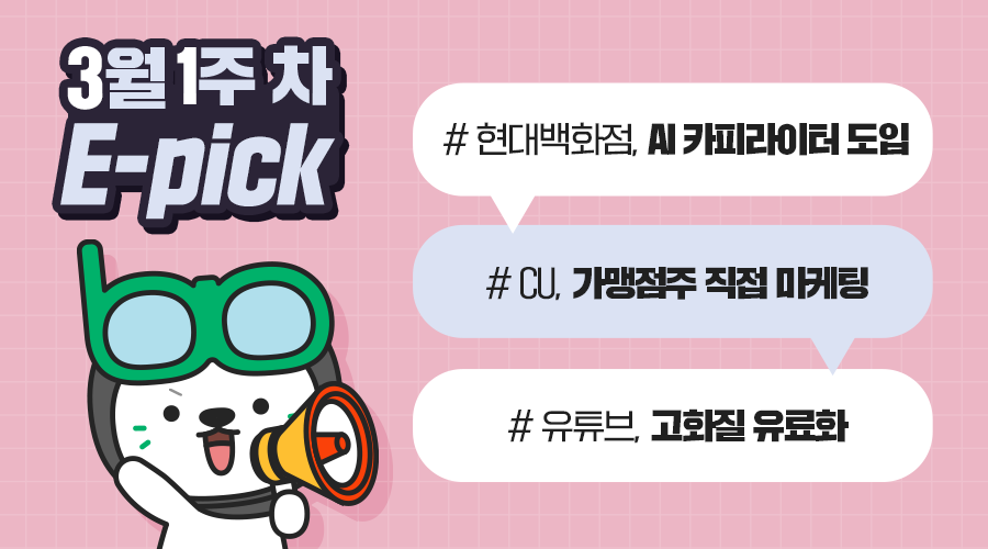 이루다마케팅의 PICK을 받은 한 주간의 이슈를 알아보는 시간! 오늘은 현대백화점, AI 카피라이터 도입 / CU, 가맹점주 직접 마케팅 / 유튜브, 고화질 유료화 소식을 준비했어요. 어떤 내용인지 함께 살펴볼까요?👀