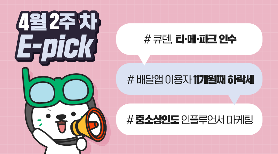 이루다마케팅의 PICK을 받은 한 주간의 이슈를 알아보는 시간! 오늘은 큐텐, 티·메·파크 인수 / 배달앱 이용자 11개월째 하락세 / 중소상인도 인플루언서 마케팅 소식을 준비했어요. 어떤 내용인지 함께 살펴볼까요?👀