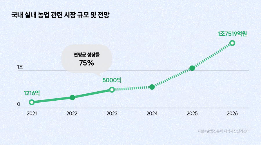 앞서 살펴본 사례들만 봐도 식물과 관련된 산업의 성장은 불을 보듯 뻔하다고 할 수 있어요. 한국발명진흥회 지식재산평가에 의하면 국내 실내 농업 관련 시장 규모가 코로나 팬데믹 시기 2021년 1,200억 원에서 2026년에는 1조 7,500억 원으로 늘어날 것이라고 예상했어요. 연평균 성장률은 무려 75%로 매우 긍정적으로 전망하고 있죠.