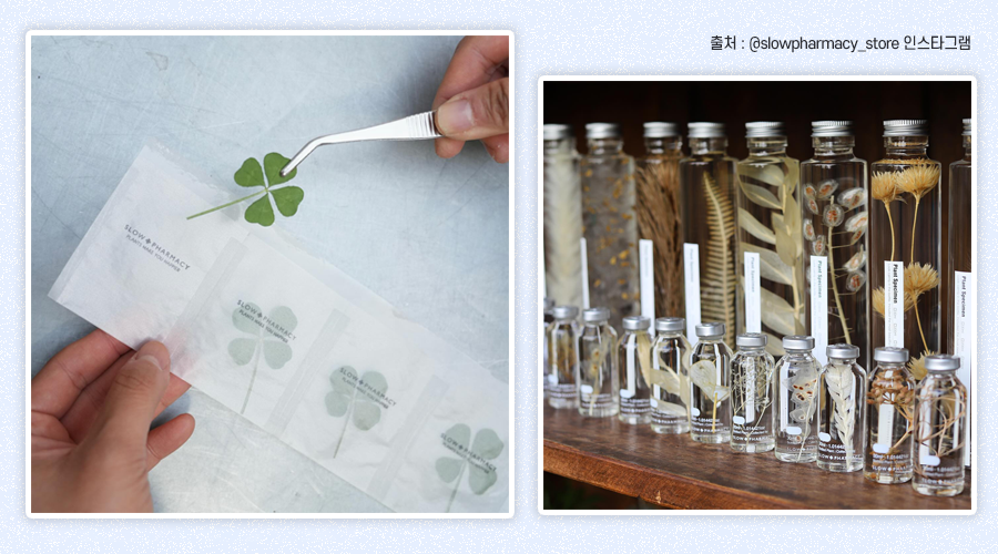 쇼룸의 곳곳에는 약국이라는 컨셉에 어울리는 상품들이 여럿 있는데요. 약봉지 안에 포장되어 있는 네잎클로버부터 한약방에서 볼법한 비주얼의 식물표본까지 이런 세세한 부분들에서 정말 여기가 약국이 아닐까 하는 새로운 경험을 하게 될 거예요!