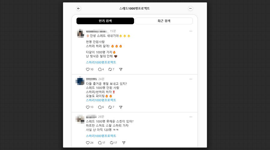 - 사진과 영상을 올릴 수도 있지만, 글 위주라서 게시글이 대체로 간결해 빠르게 지나갑니다. 또 내부적으로 ‘스레드1000명프로젝트’라는 해시태그를 많이 볼 수 있었는데요. 이 때문인지는 모르겠으나 타 계정을 팔로우하고 팔로워를 쌓는 데도 속도감이 느껴집니다.