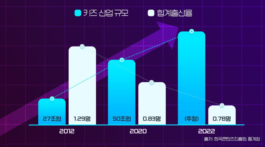 한국콘텐츠진흥원의 자료를 보면 10여 년 전 27조 원이었던 키즈 산업이 2020년 50조 원으로 가파르게 성장했어요📈