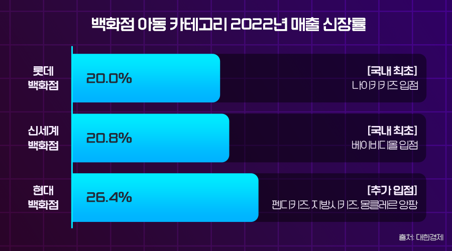 특히 프리미엄 명품 브랜드👗 매출이 크게 상승했는데요! 대표 백화점 3사의 아동 카테고리 매출 신장률을 보면 2021년 대비 2022년에 롯데백화점이 20%, 신세계백화점이 20.8%, 현대백화점이 26.4% 올라간 걸 알 수 있어요. 명품 키즈 브랜드를 중심으로 매출이 상승하자 더 많은 브랜드를 신규로 입점하고 기존 매장들을 리뉴얼하는 움직임이 나타나고 있어요.