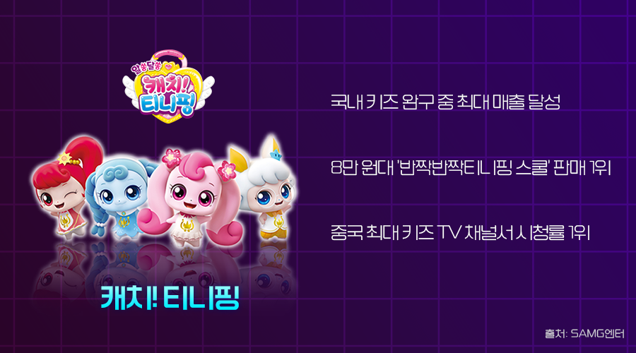 SAMG엔터테인먼트 애니메이션 ‘캐치! 티니핑’이 현재 캐릭터 산업의 새역사를 쓰고 있어요. SAMG엔터테인먼트의 2022년 매출액 630억 원 중 500억 원이 티니핑 완구로 모아들인 거라고 해요. 또한 온라인 커머스에서 포켓몬에 이어 국내 키즈 완구 중 최대 매출을 달성했어요. 아이들 사이에서 인기 있는 상품이 8만 원대 ‘반짝반짝티니핑 스쿨’인데, 부담스러운 가격에도 5만 원대 다른 상품들보다 판매율이 높아요.