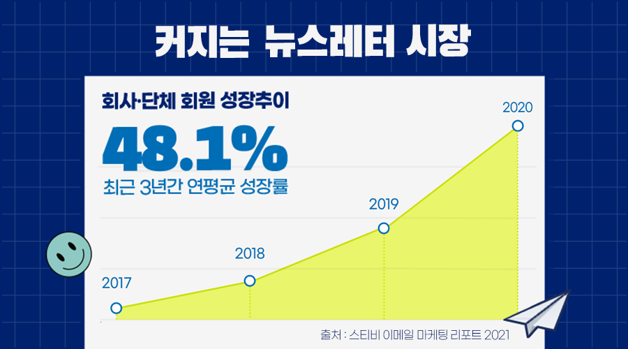 뉴스레터의 영향력을 인지한 기업들이 늘어나면서 뉴스레터 시장의 성장도 가파르게 상승하고 있어요📈 이메일 뉴스레터 서비스 스티비(Stibee)가 발행한 <이메일 마케팅 리포트 2021>에 따르면 회사 · 단체 회원의 최근 3년간 연평균 성장률이 48.1%라고 해요.