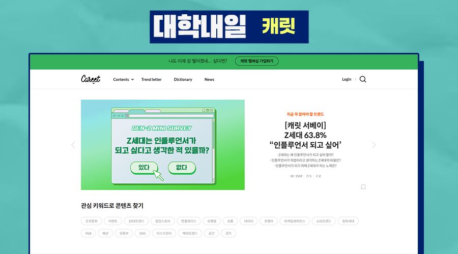캐릿은 20대 트렌드 조사를 전문으로 하는 대학내일에서 운영하는 뉴스레터인 만큼 MZ세대의 가치관과 트렌드를 디테일하게 알 수 있어요. 뉴스레터를 구독하면 매주 1회 메일로 받아볼 수 있고요. 멤버십 가입을 하면 사이트에서 매일 업데이트되는 소식을 확인할 수 있습니다.