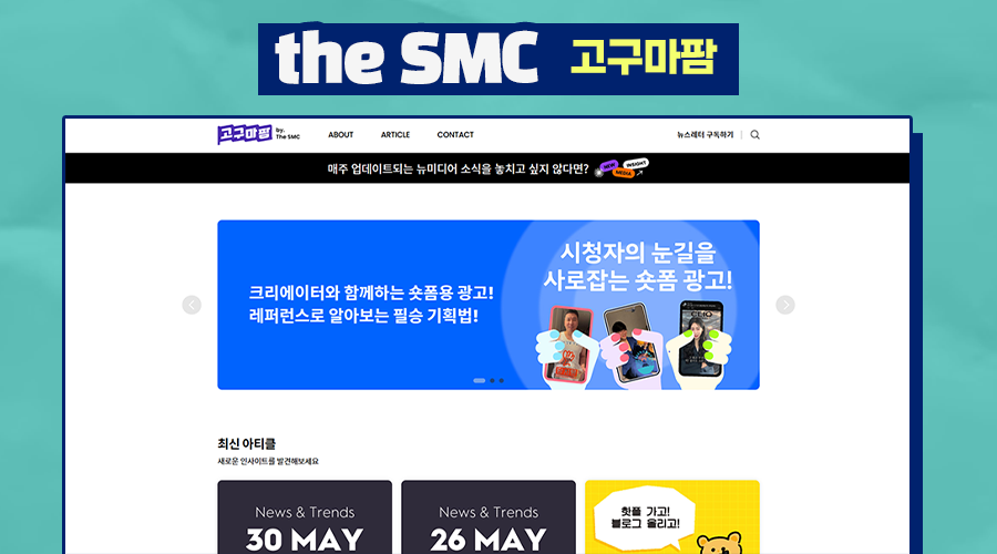 the SMC에서 운영하는 뉴스레터 고구마팜은 뉴미디어 관련 최신 소식부터 브랜딩, 인플루언서, 콜라보 등 다양한 마케팅 사례를 보기 쉽게 전달해 줘요. 특히, 클릭을 부르는 카피 문구와 재미있는 썸네일 구성이 눈길을 사로잡아요.