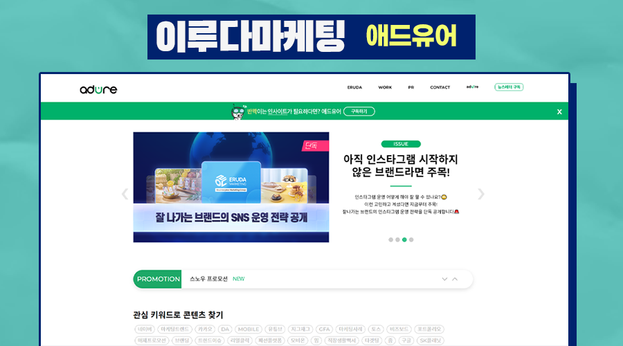 애드유어(adure)는 종합 디지털마케팅 에이전시 이루다마케팅에서 발행하는 뉴스레터로 eruda를 거꾸로 뒤집은 데에서 착안한 네이밍이에요. 여기에 광고를 뜻하는 ad와 you're를 u're로 축약해 '당신을 위한 광고/마케팅 이슈를 큐레이션 해준다'는 의미를 담고 있어요.