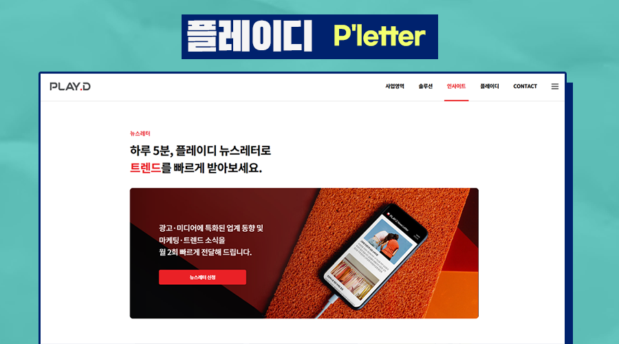 KT그룹 마케팅대행사 플레이디가 발행하는 뉴스레터로 미디어 · 광고에 특화된 업계 동향과 마케팅 소식을 알 수 있어요. 특히, 플레이디에서 자체 발간하는 업종별 리포트도 확인할 수 있어 업무에 활용하기 유용하답니다.
