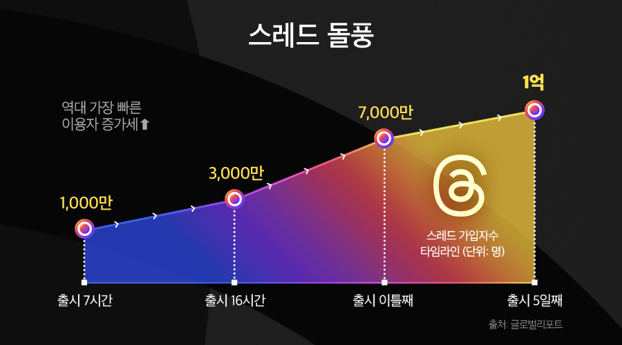 스레드가 주목받은 또 다른 이유는 바로 출시 후 엄청난 이용자 증가세를 보였기 때문이에요. 글로벌리포트에 따르면 스레드는 출시 7시간 만에 가입자 1,000만 명을 달성했고요. 출시 24시간 만에 가입자 수 5,000만 명, 출시 5일 째에는 무려 1억 명을 돌파했어요. 이로써 스레드는 챗GPT가 세운 1억 유저 달성 기록이었던 2개월을 압도적인 페이스로 추월하며 역대 가장 빠른 이용자 증가세를 보인 플랫폼이라는 기록을 세웠어요.