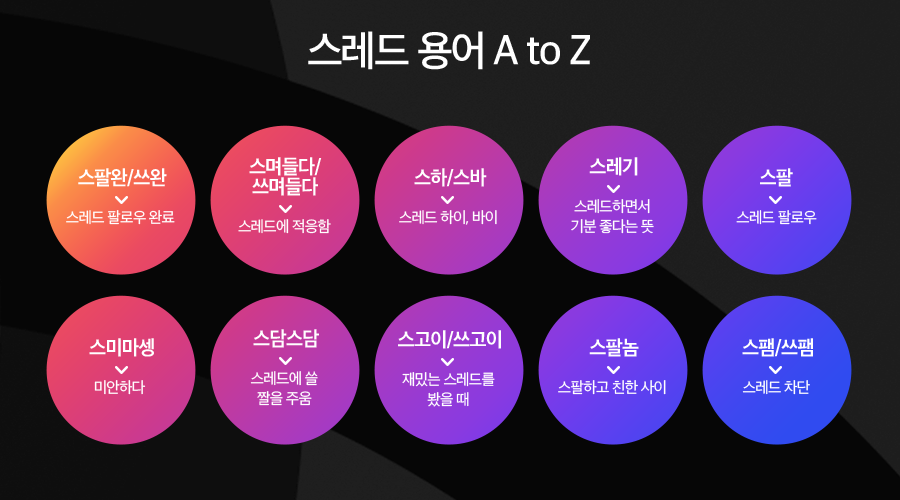 무슨 뜻인지 모르시겠다고요? 욕같이 보이지만.. 🙄 욕이 아니고 스레드의 등장과 함께 생겨난 스레드 신조어들이에요! 스레드를 시작하기 전 꼭 익혀야 할 대표적인 용어들이니 확인하고 메모하기📝