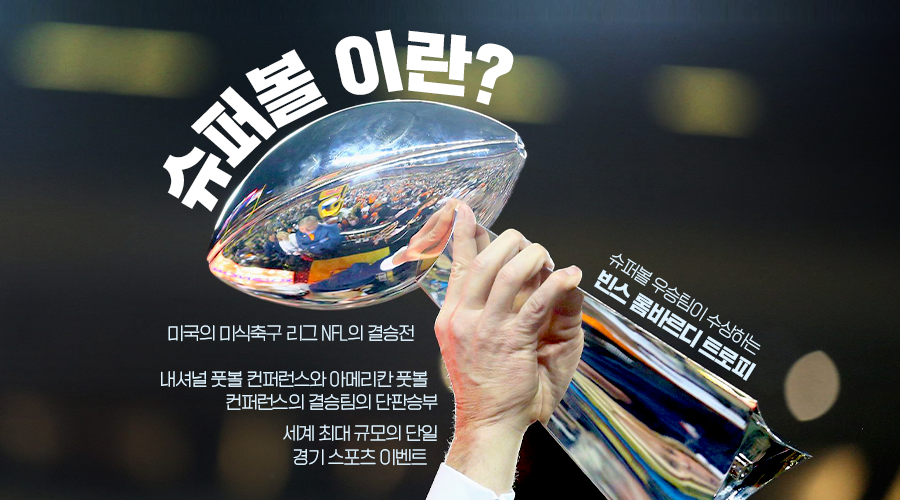 슈퍼볼은 미국의 미식축구 리그 NFL의 결승전이에요. NFL의 양대 컨퍼런스인 내셔널 풋볼 컨퍼런스와 아메리칸 풋볼 컨퍼런스의 결승팀이 단판 승부를 벌이는 미국에서 가장 큰 스포츠 행사랍니다🏈 슈퍼볼 우승팀은 '빈스 롬바르디'라는 트로피를 수상하게 되는데 세계적인 명품 브랜드 업체인 티파티앤코가 제작하며, 순은으로 제작되기 때문에 제작비가 무려 1만 5500달러(한화 약 1550만 원)라고 해요. 정말 어마어마하죠?
