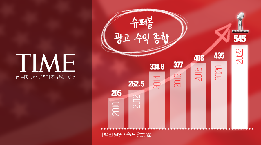그 이유는 바로 광고 수익에 있어요! 슈퍼볼의 광고 수익 역시 매년 증가하고 있는 추세인데요📈 지금으로부터 10년 전인 2010년에는 2억 500만 달러(한화 약 2700억 원)이었던 반면, 2022년에는 5억 4500만 달러(한화 약 7160억 원)로 광고 수익도 정말 슈~퍼 그 잡채👍🏻