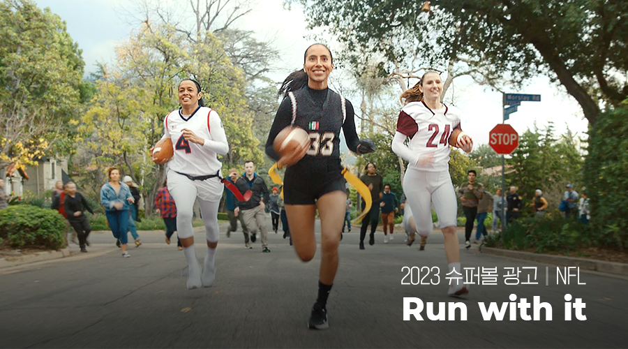 2023년, 제57회 슈퍼볼을 기념해 미식축구 프로 리그 NFL이 진행한 광고에요. 영상은 멕시코의 여성 NFF 쿼터백인 다이애나 플로레스(Diana Flores)의 유쾌한 인터뷰로 시작해요. 기자는 인터뷰 도중 그녀의 공을 뺏으려 시도하고, 플로레스는 공을 뺏기지 않기 위해 광고 제목처럼 ‘Run with it (함께 뛰어)’, 90초 내내 쉬지 않고 질주하기 시작해요🏃🏻♀️