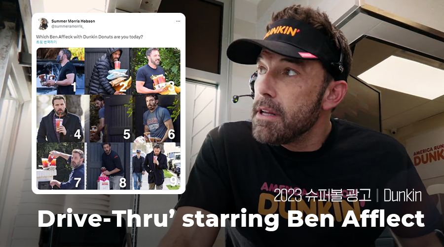 던킨은 이번 슈퍼볼 광고로 벤 에플렉의 던킨 밈을 활용했어요! 손님이었던 밴 에플렉은 광고에서 드라이브스루 직원으로 등장하는데 광고는 밴 애프렉을 보고 놀라는 손님의 모습, 밴 에플렉의 보스턴 억양 그리고 아내 제니퍼 로페즈의 등장을 코믹하게 담았답니다. 손님들의 꾸밈없는 리엑션을 재밌게 담았다는 점에서 대중에서 많은 호평을 받은 광고에요.