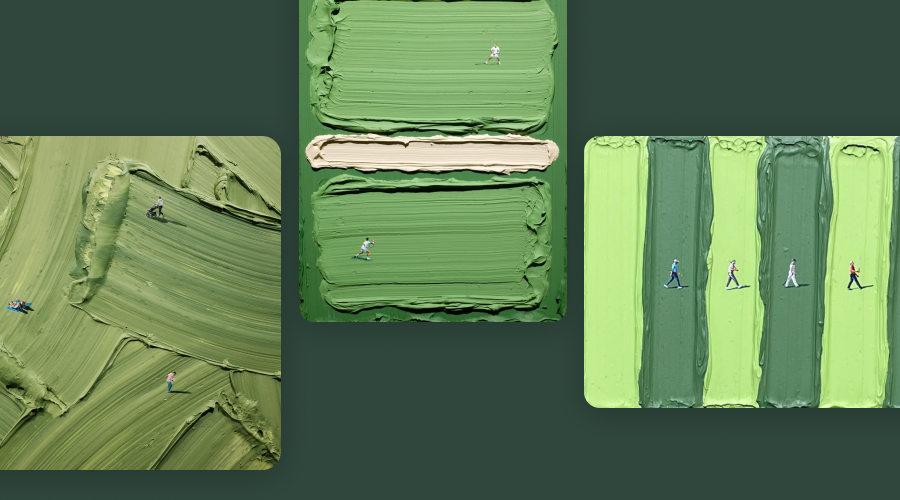'Forbidden Grass' 시리즈는 워너 브롱크호스트의 대표작 중 하나입니다. 물감이 두껍게 덧발린 초록 잔디밭 위에, 작고 섬세한 인물들이 살아 움직이듯 그려져 있죠. 단순하지만 강렬한 색감, 미니멀한 질감 위에 놓인 미니어처 같은 디테일. 그의 작품은 멀리서 보면 하나의 풍경이지만, 가까이 다가가면 삶의 수많은 이야기가 숨어 있습니다.