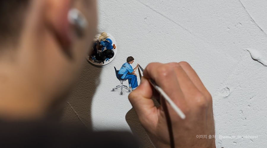 이 작은 인물들을 그리게 된 데는 또 다른 이유가 있습니다. 워너는 한때 목공을 하면서 가구를 만들게 되었는데, 가구를 만들면 남게 되는 자투리 나무 조각에 그림을 그렸다고 해요. 남은 자투리 나무 조각 위에 그림을 그리며 '좁은 공간에 세상을 담는 법'을 배웠습니다. 그러다 보니 자연스럽게 작은 존재들을 그리는 디테일이 발전하게 된 거죠.
