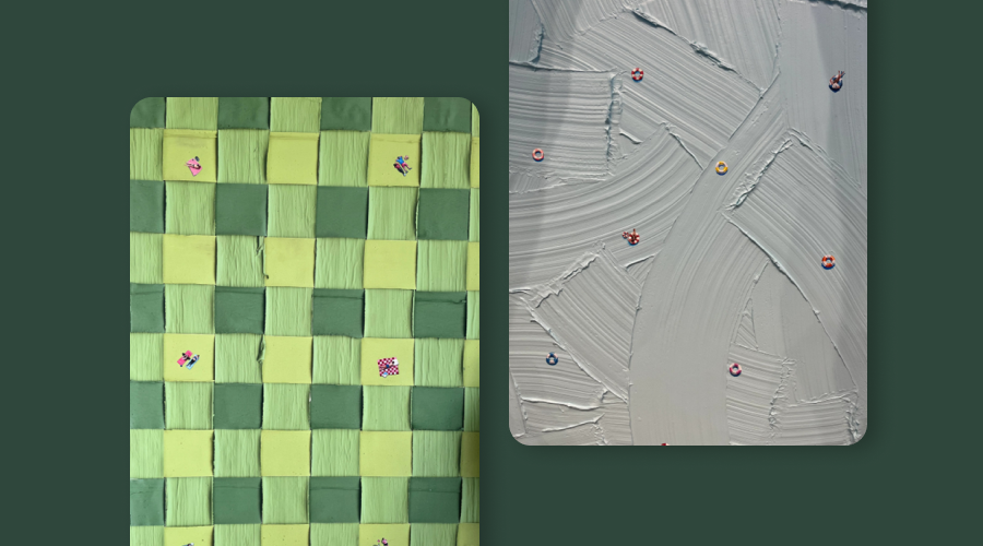 그의 표현 방식은 고등학교 시절부터 시작됐습니다. 오일, 아크릴, 수채화, 목탄, 연필 등 다양한 재료를 사용했고, 캔버스에 독특한 흐름과 질감을 만드는 방법을 익혀나갔다고 합니다. 하지만 그만으로는 무언가 부족했습니다. 그래서 그는 그 위에 작은 인물들을 그려 넣기 시작했습니다. 그것이 지금의 작업 방식으로 이어진 시작이었죠.