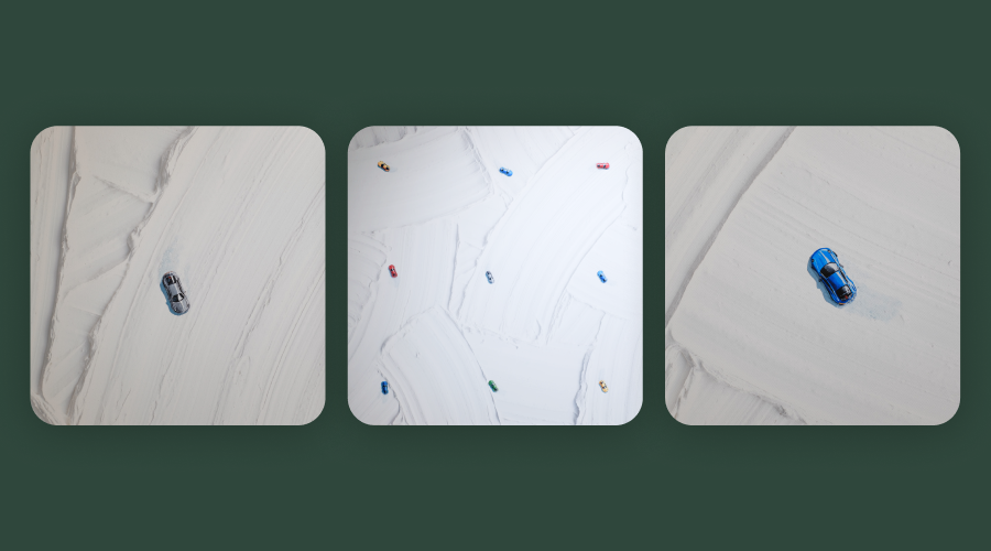 하얀 눈 위를 달리는 포르쉐는, 거친 캔버스 질감과 어우러지며 낯선 조화를 만들어냅니다. 익숙한 풍경이지만, 스케일의 대비 덕분에 더욱 극적이고 신선하게 다가옵니다.