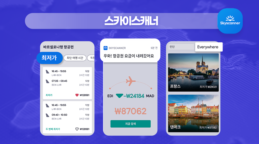 해외여행을 계획한다면 가장 먼저 해야 할 일! 바로 항공권🎫 예매예요. 스카이스캐너는 세계의 항공권 예매사이트를 모아 보여주는 플랫폼으로, 최저가 항공권을 찾기 좋아요.
